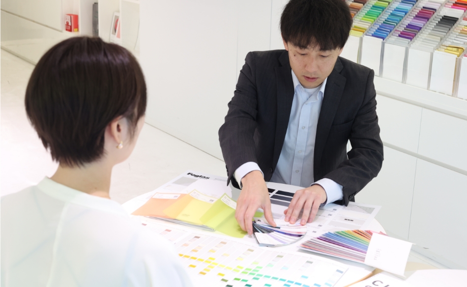 中川ケミカルのショールーム「CSデザインセンター」では、実際のシートの色味や質感をご確認いただけるだけでなく、イメージを実現するための加工・施工手法等についてアドバイスをいたします。事前にご相談内容をご連絡いただけますと、専門スタッフより具体的なご案内が可能です。
