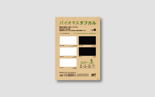 屋外用装飾フィルム「タフカル」にバイオマス(※1)を10%配合した「バイオマスタフカル」が新登場しました。フィルム・粘着剤の10%がバイオマス由来の材料で構成されており、化石燃料の使用を削減することができます。これにより、温室効果ガスの排出量を低減し、地球温暖化対策に貢献します。