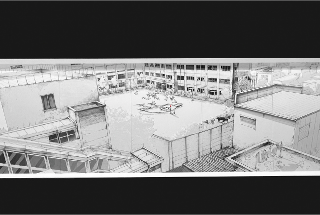 いまや廃れつつあるスクリーントーンを継続させたいという思いから、普段の制作で商業マンガに使われるインクとスクリーントーンで作品を制作している。「体感的」な経験をもたらす鑑賞では作品の物理的なサイズが肝心で、観客、作品、空間の三つの関係は、名作のひとコマに圧縮された劇性を伴いながら、マンガにはないスケールで融合する。それを可能にするために、今回は市販のスクリーントーンではなく、カッティングシートでトーンを自作した。異なる柄で影やグラデーションを演出する。重ね貼りで濃い部分や明るい部分の表現を分ける。全体的にコラージュ的感覚でカッティングシートを重層的に貼る。これらの手法を通じて、画材としてのカッティングシートの新たな可能性を探求していきたい。