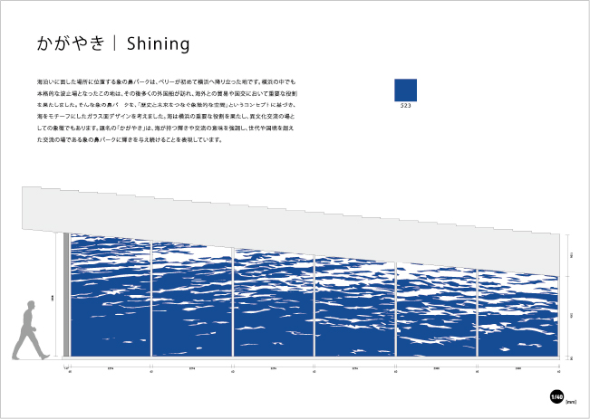 象の鼻パークは、海岸沿いに位置し、ペリー提督が初めて横浜に上陸した歴史的な場所です。この地は横浜における最初の本格的な波止場として、その後多くの外国船が寄港するようになり、対外貿易や国際交流において重要な役割を担いました。かかる歴史的背景を有する象の鼻パークを、「歴史と未来をつなぐ象徴的空間」とするコンセプトのもと、海をモチーフにしたガラス面のデザインを考えました。海は横浜の発展において極めて重要な要素であり、異文化交流の象徴でもあります。作品名「かがやき」は、海が持つ輝きと交流の意義を強調し、世代や国境を超えた交流の場としての象の鼻パークが永続的に輝きを放つことを表現しています。