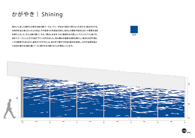 象の鼻パークは、海岸沿いに位置し、ペリー提督が初めて横浜に上陸した歴史的な場所です。この地は横浜における最初の本格的な波止場として、その後多くの外国船が寄港するようになり、対外貿易や国際交流において重要な役割を担いました。かかる歴史的背景を有する象の鼻パークを、「歴史と未来をつなぐ象徴的空間」とするコンセプトのもと、海をモチーフにしたガラス面のデザインを考えました。海は横浜の発展において極めて重要な要素であり、異文化交流の象徴でもあります。作品名「かがやき」は、海が持つ輝きと交流の意義を強調し、世代や国境を超えた交流の場としての象の鼻パークが永続的に輝きを放つことを表現しています。