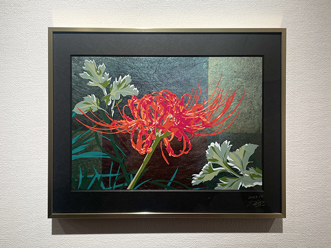 そして新たな試みとして、全てカッティングシートで秋冬の花々を表現した作品を新作として発表します。一連の作品では絵筆を一切取らず、全てシールのみで制作しましたが、その代わりこの創作に至るまでに数多くの絵画に触れ、私なりの絵画に対する敬意を込めました。そして、筆致の痕跡を残さずフラットな表面にさせることで、色合いのバランスと構図の配置に焦点を当て、あるがままの自然の美しさを情緒的に表現することに挑戦しています。