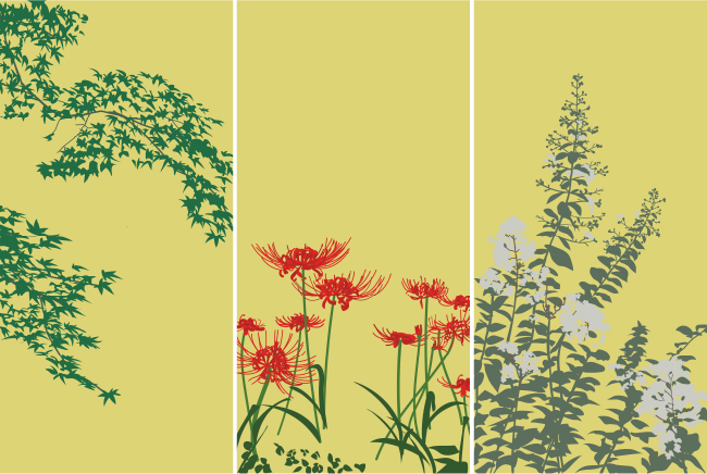 「十三夜月」をテーマに、ショールーム入口にある7面のガラスを屏風に見立て、竹林画を表現するほか、ショールーム内の可動ガラスには月やヒガンバナ、モミジなどの秋のモチーフをあしらいます。背景色にはカラーフィルムにすりガラス調フィルムを重ね貼りしており、後ろにある景色がぼんやりと透けて見えるようにデザインされています。作品の世界に没入できるような空間になっておりますので、ぜひご来場いただき、実際にご覧ください。
