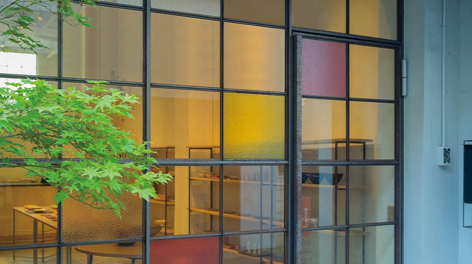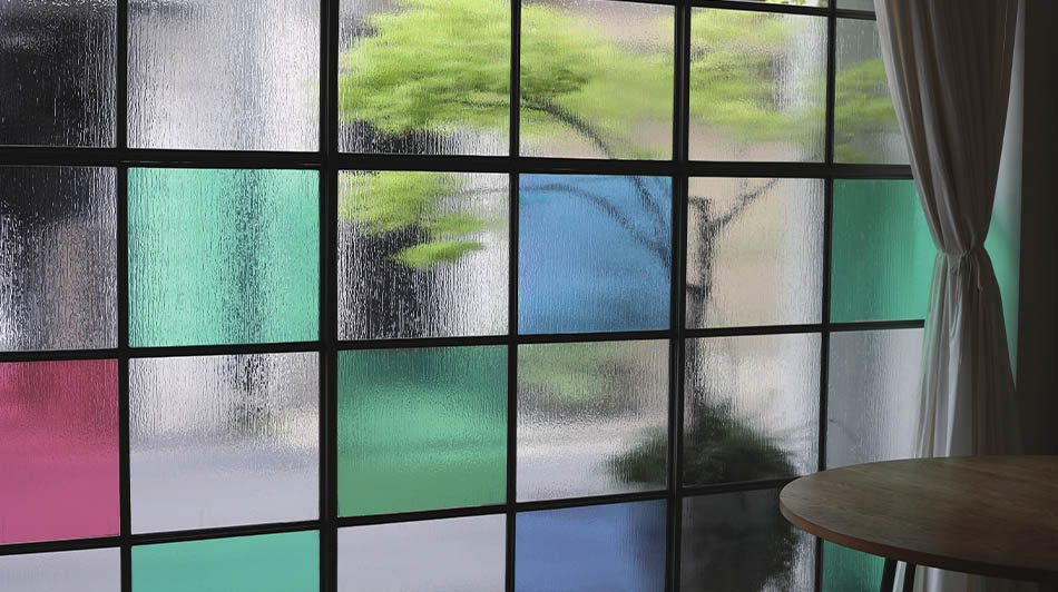 アンティークガラス調シートと透明色シートの「IROMIZU®」などを組み合わせることで、レトロな風合いと透明感のあるカラーを活かした表現をが可能に。組み合わせによるカラーバリエーションを活かせば、シックからポップまで多彩な印象を作り出せます。-09」と、波ガラスのような独特のテクスチャーが魅力の「C-10」、2種類をご用意しております。どちらも光の透過をやわらげ、目隠し効果があります。