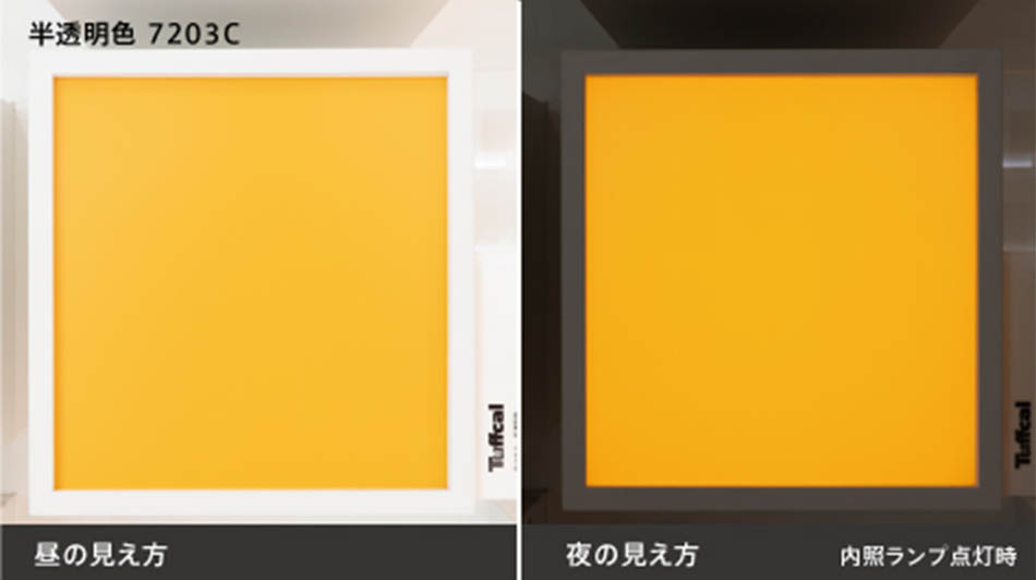 昼夜での色変化が少なく、表面色と透過色が近い特性を持つため、内照式サインに適しています。半透明色のため、透明色に比べて光源が目立ちにくいです。