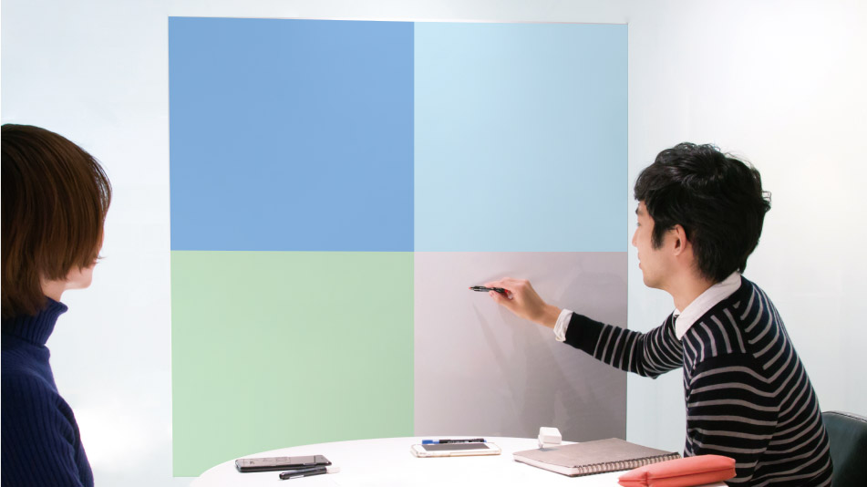 壁やガラス面に貼り付けるだけでホワイトボードにできる、ホワイトボードシート。会議室や学校など、限られたスペースを有効活用することができます。設置環境や用途に合わせて様々な種類をご用意しております。