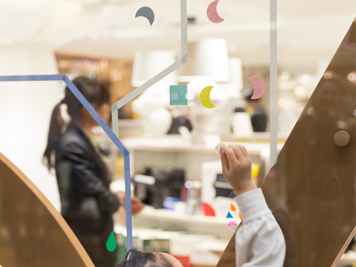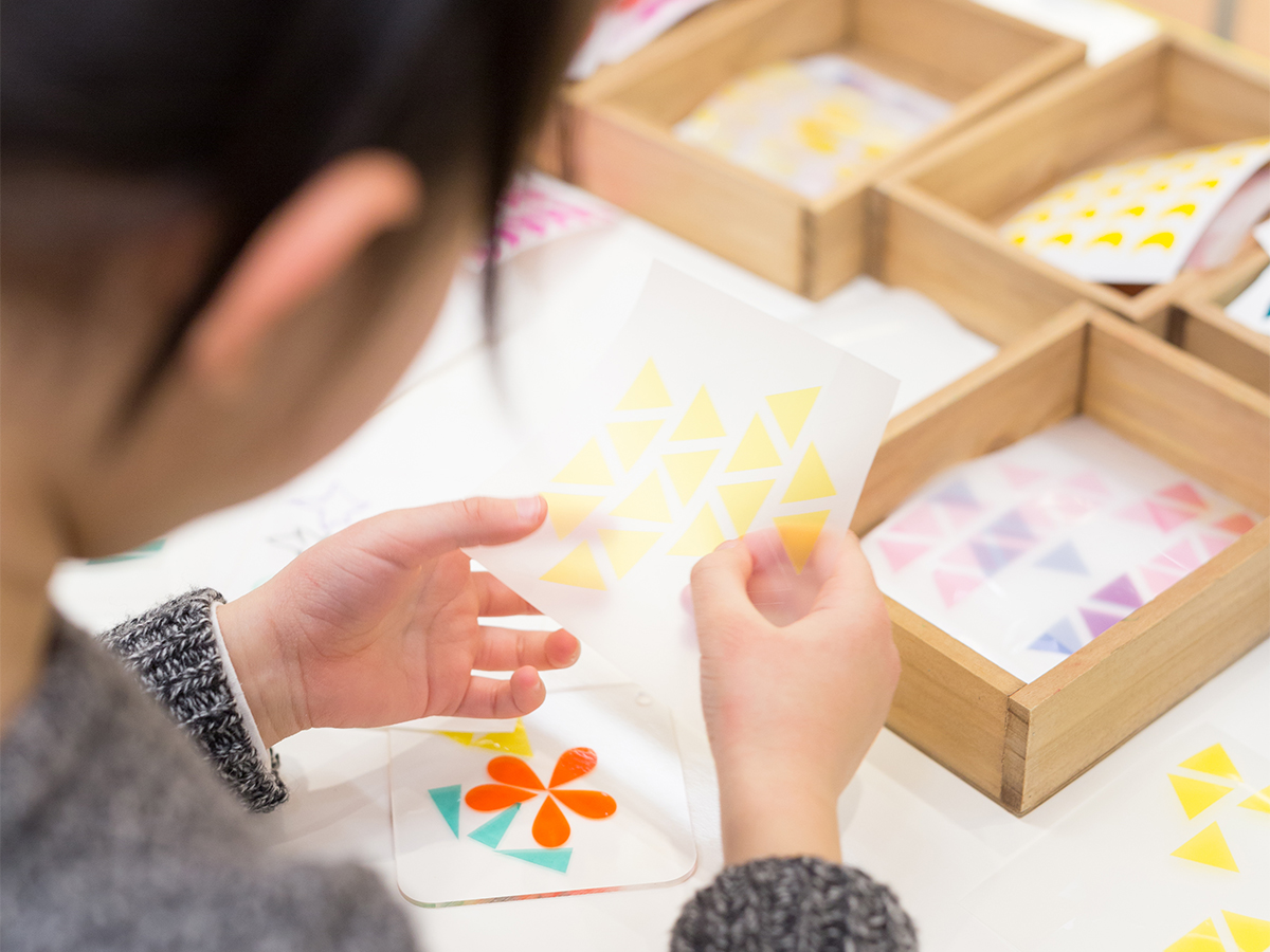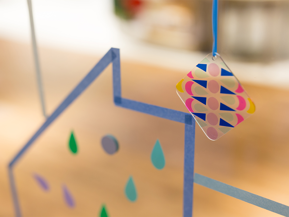 みずたまの道路、しましまの壁、さんかく窓のビル・・・、同じかたちがたくさん集まると、模様ができます。イメージをふくらませながら、カッティングシートを貼りもようのまちを完成させました。