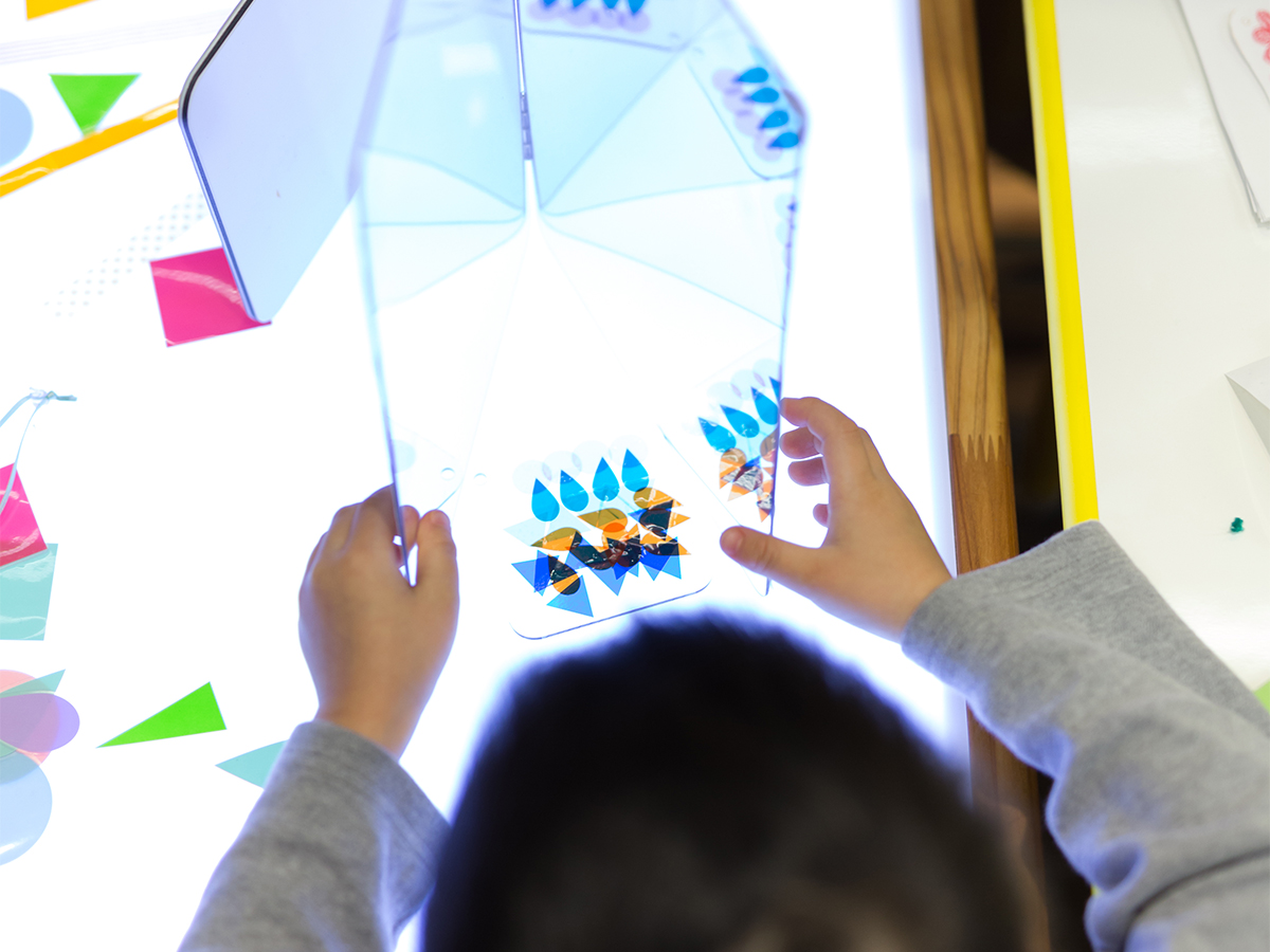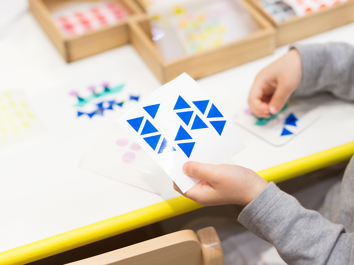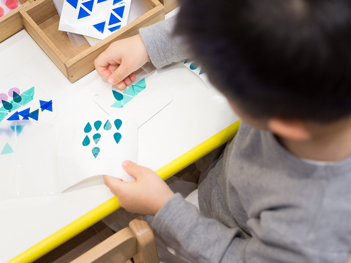 みずたまの道路、しましまの壁、さんかく窓のビル・・・、同じかたちがたくさん集まると、模様ができます。イメージをふくらませながら、カッティングシートを貼りもようのまちを完成させました。